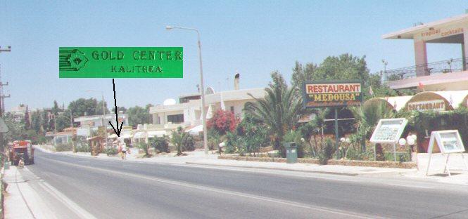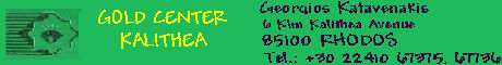 Finden kann man das Geschäft ganz einfach: An der Hauptstrasse in Kalithea gibt es nur 1 Ampel, genau an dieser Ampel ist der Laden, (es ist der Abzweig nach Koskinou) rechte Seite, Richtung RHO-Stadt. Sollten Sie Gast im KMP sein, von hier aus sind es 2,5 km bis zu Georgios, könnt Ihr ihn auch einfach anrufen: 22410-67375 ! Er kommt Euch holen ans Hotel. Direkt neben an ist die Autovermiertung: "Kalithea Rent a Car". Ein Haus weiter gibt es einen kleinen Supermarkt, daran schliesst sich ein kleines Modegeschäft, welches die Frau von Georgios führt. Abrunden tut alles noch eine kleine Bar, links neben der Goldschmiede - es ist wohl überflüssig zu sagen: "Alles EINE Familie!"